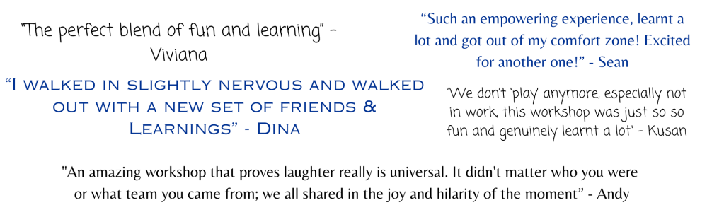 These workshops are so fun! We’ve done two now and couldn’t recommend it enough. Great for team bonding, de-stressing and learning some relatable improv skills!